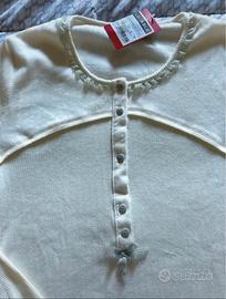 • la maglia a costine leggermente elasticizzata ,sfiancata e lunga, con inserti in pizzo nel collo e nei polsini a sbuffo con elastico,