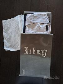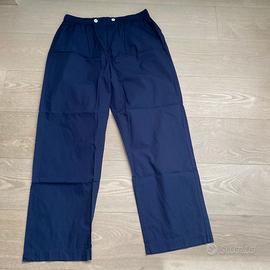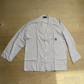 Pigiama uomo Blu Energy Underwear in cotone, taglia 50. Giacca bianca a righe rosso/blu, chiusura a 4 bottoni, taschino con ricamo. Torace cm. 58. Pantalone tinta unita unita blu, vita con elastico e 2 bottoni. NO etichetta di composizione e manutenzione. Completo di scatola.