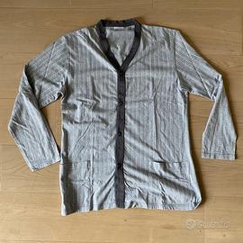Pigiama uomo Denny's in jersey misto cotone, taglia 50. Giacca grigio melange a righe bianco/grigio scuro, chiusura a 4 bottoni, 2 taschini. Torace cm. 56. Pantalone tinta unita unita grigio scuro, vita con elastico. Composizione 70%Cotone 30%Poliestere.