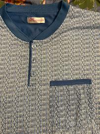 Colori: bianco con motivi e risvolti blu tortora, la maglia; blu tortora, i pantaloni. Maglia con taschino.