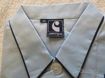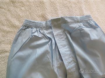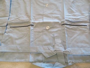 Pigiama azzurro in tela da uomo taglia 48 con elastico in vita e chiusura pantaloni davanti con bottoni nascosti da pattella. La camicia è chiusa da bottoni e ha la cintura in vita. Dimensioni del pantalone: lunghezza gamba dalla cintura 102 cm lunghezza gamba dal cavallo 70 cm larghezza fianco 58 cm larghezza vita 31 max 34 cm Dimensioni camicia: lunghezza corpo dal collo 70 cm lunghezza corpo da sotto ascella 45 cm larghezza collo 34 cm lunghezza manica da ascella 50 cm lunghezza manica da spalla 60 cm larghezza polso 14 cm larghezza fianchi 53 cm Marca: CAMARGUE Nuovo mai usato.