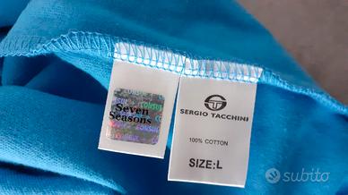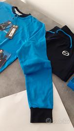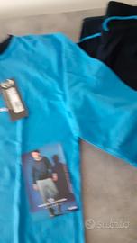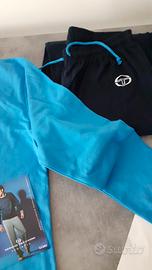 Pigiama uomo nuovo con etichetta, Sergio Tacchini. Maglia azzurra con polsini blu e pantaloni blu lisci con Cordone azzurro per stringerli in vita. Cotone