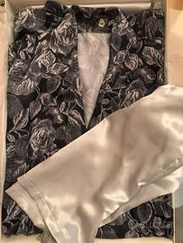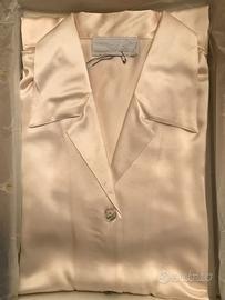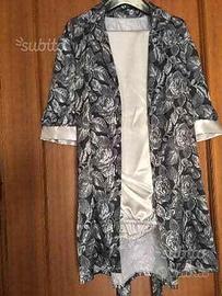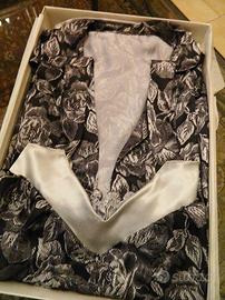 pigiama donna, foto 1 e 2 seta colore panna tg. S, e XL, foto 3 pigiama raso 4 pezzi colore grigio stampa fantasia tg. 46, formato da pigiama corto e pigiama lungo pantalone tinta unita grigio giacca con cintura come foto 4