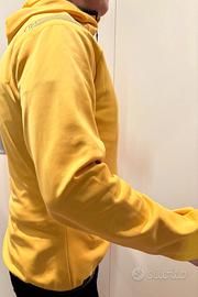 Pile da uomo con cappuccio, colore giallo, media pesantezza, cerniere nere.