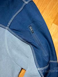 Vendo felpa in pile bicolore grigio e blu navy, taglia XL, in ottime condizioni. Modello sportivo con mezza zip frontale e colletto alto, ideale per mantenere il calore nelle giornate più fresche.