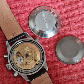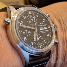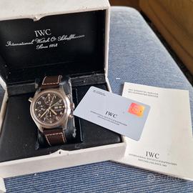Raro orologio crono rattrappante IWC Doppelchronograph (Split Second Fleigerchrono) Prima serie MK1: ref. 3711-02 day-date con giorno in italiano. Quadrante al trizio e vetro zaffiro "domed" prodotto in soli 3000 esemplari dal 1992 al 1995. (La seconda serie 3713 piu comune aveva quadrante Luminova e vetro piatto) Quadrante nero,DayDate al 3 Cassa in acciaio diametro 42mm numerata, con doppio fondello in ferro dolce a protezione dei campi magnetici Movimento di manifattura calibro 79230 con finitura dorata Completo di fibbia ad ardiglione originale in acciaio e di scatola + garanzia del 1994 + panno in microfibra per pulizia orologio originale,nuovo mai utilizzato. Orologio inserito e verificato sul sito myiwc.iwc.com/it/portfolio. a garanzia di originalità e lecita provenienza. In buone condizione estetiche e di funzionamento vendo o permuto/ scambio con altro orologio di pari pregio e valore.