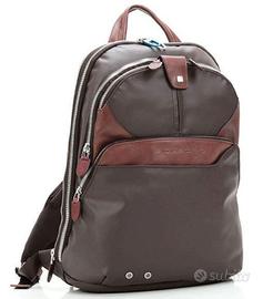 Zaino Piquadro realizzato in vera pelle, c'è un sedimento principale con un vano per un computer portatile da 12 pollici e iPad. In cima ci sono due tasche con impronte digitali per carte di plastica, al centro - un ombrello e un deposito bottiglia.