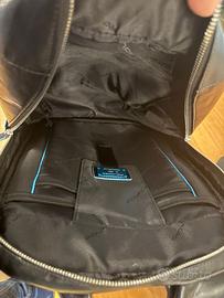 Zaino Piquadro linea Blue Square in pelle nera con porta Pc 14" e porta iPad®Air-iPad Pro 9.7/iPad 11", tasca porta bottiglia esterna, spallacci regolabili, sistema d'aggancio trolley con cordella, tasche interne porta oggetti, porta cellulare e porta penne interni.