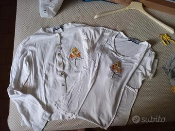Piumino blu scuro con ricamo di BUX BUNNY (taglia XL junior-ma vestibilità per 14-16 anni o anche taglia 40-42 donna) 50 euro, camicia bianca (taglia XXL) con ricamo di BART SIMPSON 20 euro leggermente ingiallita sulle spalle per non uso, magliocino e t-shirt in cotone bianco con ricamo di TITTI (taglia 42) 20 euro.