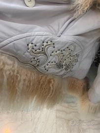Piumino in misto seta con ricami e bordi collo e finitura e maniche con pelliccia ricami sulla parte anteriore color rosa cipria capo molto leggero e caldo nuovo con cartellino