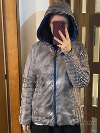 Piumino 100 grammi con cappuccio donna reversibile: da una parte è un color blu acceso e dall'altra un motivo bianco - nero. Presenta le tasche in entrambi i lati, dal lato blu le tasche sono chiudibili con due zip.