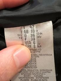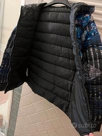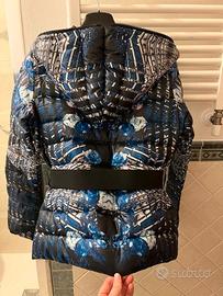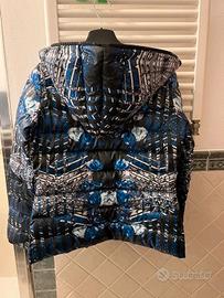 Piumino 100 grammi (molto caldo perché in piumino d’oca) con stampa floreale sui toni del blu su base nera. Cintura elastica in vita rimovibile. Tasche laterali. Zip con doppia apertura, che si chiude lungo tutto il cappuccio. Incluso lo zainetto nello stesso tessuto e stampa, comodissimo per raccogliere il piumino o come portaoggetti. Chiusura in alto con zip invisibile e bottone più seconda tasca con cerniera. Tutto praticamente nuovo. Taglia 42 italiana. Vestibilità asciutta. Indossato un paio di volte prima della gravidanza, ora non più della mia taglia.