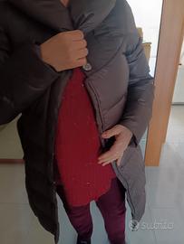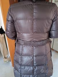 Piumino donna originale Anno Zhero, colore grigio elegante (con riflessi marroni), modello lungo midi con cappuccio fisso, chiusura zip, tasche laterali e cintura in vita per una silhouette femminile e sfiancata.