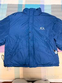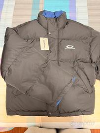Vendo piumino Balenciaga reversibile: un lato nero opaco con logo frontale, l’altro blu elettrico con lo stesso branding.