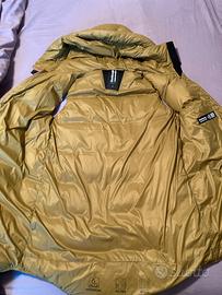 Vera piuma (vedi foto), per cui è davvero caldo e sofficione. Taglia seconda. Colore verde oliva “Tuscany Oil”.