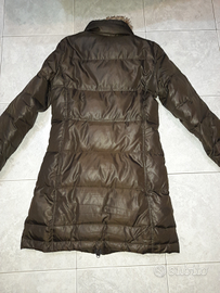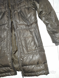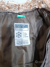 Piumino Benetton, originale, a ginocchio, leggermente avvitato, tg. 46, colore marrone, chiusura con zip, con quattro tasche di cui due grandi laterali e due minuscole nella parte superiore. Spedizione in tutta Italia.