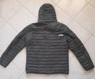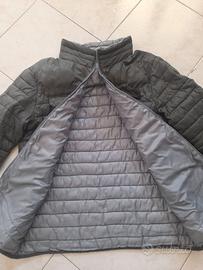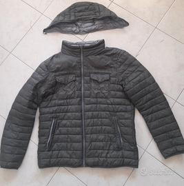 Piumino verde militare con interni grigi. Quattro tasche. Cappuccio removibile leggermente usurato sul bordo interno/esterno