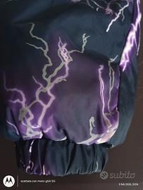 giacca imbottita ragazza dallo stile audace e moderno . La giacca è prevalentemente nera con stampa a tema fulmini viola, bianchi. Ha un taglio corto , collo alto senza cappuccio, chiusura centrale con zip di colore metallico, tasche laterali con zip. Su entrambi i lati del petto, o in prossimità delle tasche sono presenti delle etichette decorative con scritta "SHADOW FUTURE" in bianco, aggiungendo un tocco streetwear.