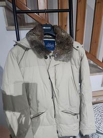 bellissimo piumino color beige chiaro, esterno tessuto cotone, interno vera piuma e piumetta, cappuccio con collo in pelliccia di lapin, buone condizioni, ottima vestibilità, taglia XXL