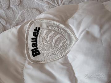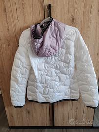 Piumino bicolore bianco e lilla nuovo mai indossato, ancora con etichetta originale Blauer. Taglia L. Modello con impuntura a onde, cappuccio e dettagli a contrasto su zip, tasche e profili. Imbottitura ecologica Repreve. Molto morbido e comodo, ideale per la mezza stagione. Due tasche con zip e tasca interna con velcro. Bordo elastico rigato su cappuccio, fondo e polsini. Logo Blauer sul petto e patch tono su tono sulla manica.