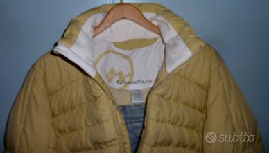 Caldissimo piumino Quetchua tg.42 - color giallo banana - cappuccio pieghevole - colletto in morbido tessuto/velluto - due tasche frontali con zip - tasca interna con zip - portaberretto interno in rete traspirante (vedi foto)- regolazione misura fondo giacca - lavabile in lavatrice - perfetto, mai usato.