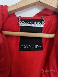 Piumino / cappotto Coconuda rosso, maniche a tre quarti e cappuccio largo ripiegato.