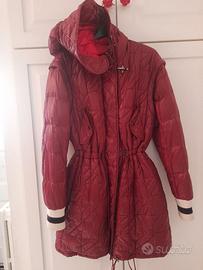 Piumino leggero ma caldo, con cappuccio e con possibilità di renderlo più aderente al corpo con i laccetti. Impermeabile, rosso fuoco all'interno, bordeaux all'esterno. Ottima vestibilità.