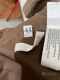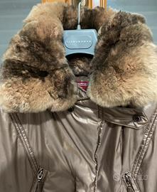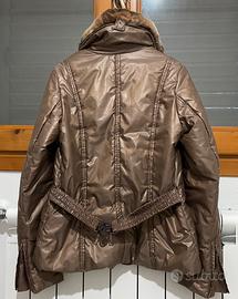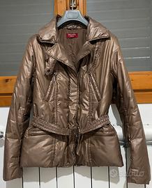 Piumino corto da donna ,marrone lucido con colletto in pelliccia staccabile , cintura elasticizzata , 4 tasche con cerniera anche sui polsini , leggero e comodo . Tg 44