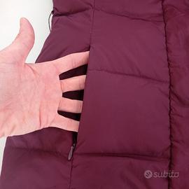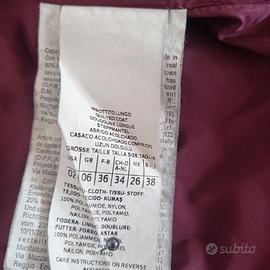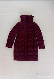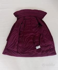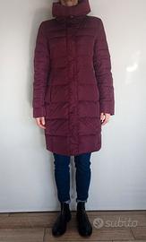 Cappotto imbottito bordeaux, in vera piuma d’anatra. Taglia: S (aderente, andrà bene anche a una XS). Collo alto, due tasche laterali. Chiusura tramite zip. Cintura staccabile. Cappotto smarchiato, comprato in Diffusione Tessile.