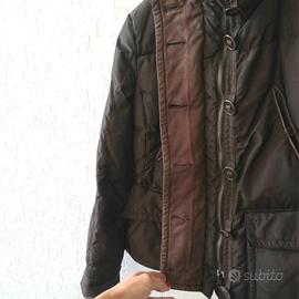 Piumino imbottito in vera piuma d'oca. Colore marrone lucido. Taglia 42 italiana. Collo alto avvolgente, due tasche a fessura e due con pattina. Modello vintage anni 2000 circa. Ottime condizioni, presenta solo la parte in tessuto scolorita (vedi ultima foto) ma quando è abbottonato non si nota. Misura spalle 40 cm lunghezza 61 cm.