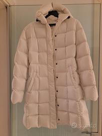 Piumino bianco, lungo fino a metà coscia, con cappuccio.