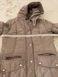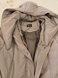 Piumino donna con cappuccio staccabile, chiusura con zip e bottoni automatici, due tasche chiuse con zip, zip tutte perfettamente funzionanti. Colore beige scuro che tende al grigio, imbottitura in poliestere, caldo. tg. M/L, vedi misure nelle foto. In perfette condizioni.