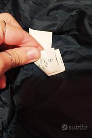 Piumino corto dal taglio elegante, veste affiancato quindi segue le curve del corpo, cinturino in vita. Collo alto per una protezione totale dal freddo e dal vento. Particolare anche il colore che è un blu notte dall'aspetto metallizzato alla luce.