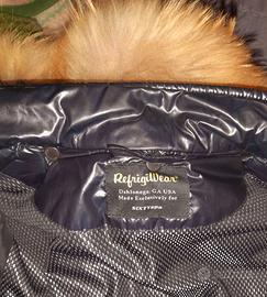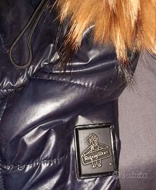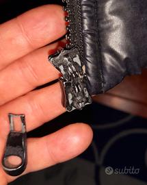 Piumino tg S blu scuro.Cappuccio con bottoni,rimovibile.Unico difetto (come da foto),la cerniera è staccata...ma si chiude perfettamente (vedi foto indossato)