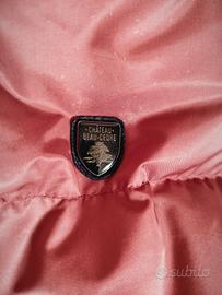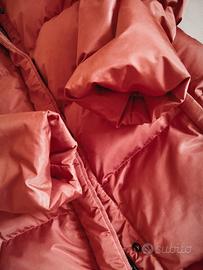 Piumino donna, tg. 42, marca Château Beau-Cedre, colore cangiante rosso acceso corallo, chiusura doppio cursore a zip e bottoni a pressione, tasche laterali con interno in pile, cappuccio removibile.