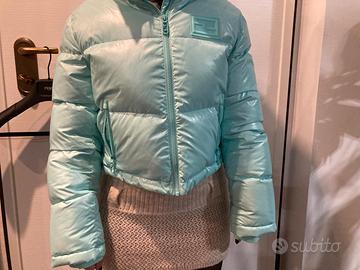 Piumino crop in nylon lucido con monogram in rilievo.