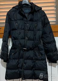 Piumino donna nero , con cappuccio e cintura , con cerniera a doppio cursore , tg 44 .usato pochissimo , pari al nuovo .