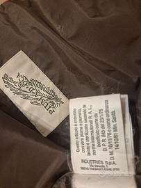 Bordi rifiniti in pelle color cuoio e cintura in vita con chiusura regolabile con moschettone. Il modello è concepito in modo tale da poter essere indossato anche senza la cintura.