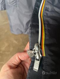 Vendo piumino da donna k-way blu con interno bordeaux e cappuccio. Taglia 7 ( veste da una 42 a una 44 comodamente)