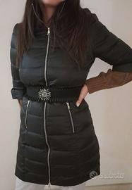 Piumino donna in vera piuma Taglia 40, nero, cintura elastica gioiello, cappuccio amovibile maniche 3/4, con manicotti neri, in perfette condizioni