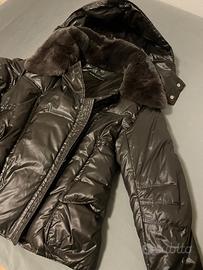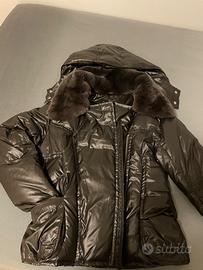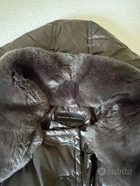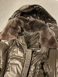 Piumino donna MASSIMO REBECCHI in piuma d’anatra colore marrone con collo in pelo e cappuccio entrambi amovibili. Chiusura con zip laterale.Taglia 46.