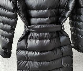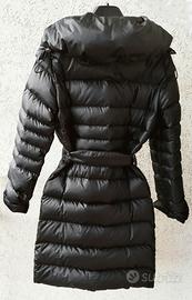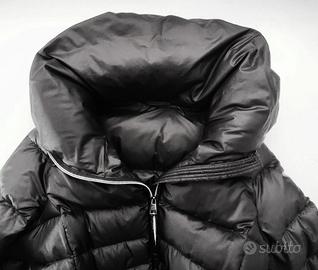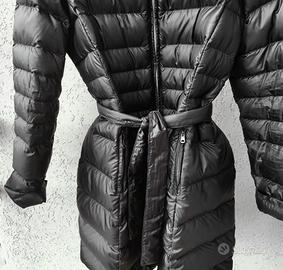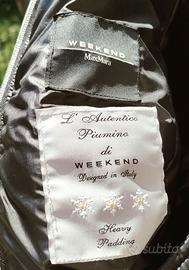 Piumino nero della linea "L'autentico piumino di Weekend" di Max Mara. Meraviglioso collo avvolgente a mo' di cappuccio. Leggerissimo (400 grammi). Con cintura.