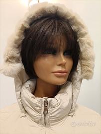 Piumino donna in vera piuma d'oca, con cappuccio staccabile con zip, cintura in vita, 2 tasche laterali con zip + tasca interna. Colore bianco panna/champagne. Taglia M. Misure: Spalle 38 Cm - Torace 47 Cm - Maniche 58 Cm - Lunghezza 57 Cm. Video articolo e altri articoli disponibili sul profilo Facebook 2EFFEMOD.