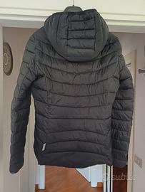 Piumino corto donna Napapijri nero 100% poliammide. Piumino leggero con cappuccio e 2 tasche.