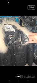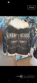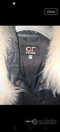 Piumino donna nero lucido Gianfranco Ferrè, taglia XS (veste S), con pellicciotto bianco a collo, polsi e fianchi, rimovibile da tutte le parti tramite zip e/o bottoni, lungo fino a metà coscia
