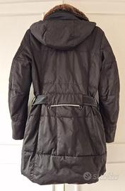 PIUMINO DONNA PEUTEREY. Modello con collo in pelliccia di coniglio e imbottitura 100% piumino d'oca. Con due tasche laterali con patta e zip, due tasche laterali a filetto, una tasca interna, una mini tasca interna, collo staccabile e cappuccio staccabile. Chiusura con zip, bottoni e cintura. Colore nero, taglia 44, come nuovo. Euro 148.