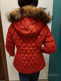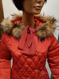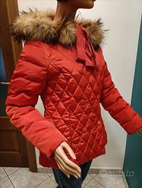 Piumino donna vera piuma d'oca, doppio petto, chiusura a clip, con cappuccio e nastri, 2 tasche laterali, colore rosso/corallo, fodera interna. Taglia M. Misure: Spalle 38 Cm - Torace 48 Cm - Maniche 62 Cm - Lunghezza 65 Cm. Prezzo Cartellino €359. Prezzo da 2EEFEMOD €80. Video articolo e altri articoli disponibili sul profilo Facebook 2EFFEMOD