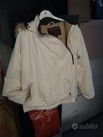 Piumino donna, con cappuccio, taglia L Marca Woolrich ORIGINALE. Colore bianco panna. In buone condizioni. Solo da mandare a lavare.