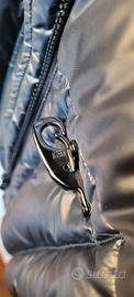 Piumino lungo realizzato in nylon lucido grigio scuro con proprietà down proof e water repellent e fodera in nylon.