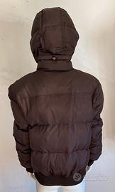 Piumino Gas in pure duck down con cappuccio ricoperto di pelliccia (il contorno di pelliccia può essere staccato dal cappuccio). Chiusura con automatici e cerniera lampo, tasche interne ottima finitura. Colore marrone. Taglia 46. Misure: ascella/ascella cm.58, giro petto cm.116, manica cm.60+polsino in lana cm.5. Condizioni come nuovo.